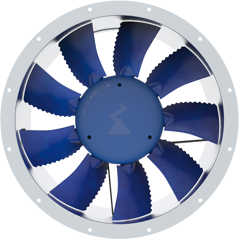 For axial fans the concept of a propeller is applied. The flow through the impeller with the (propeller) blade is largely parallel to the rotor shaft, thus, the name axial fans. The rotating blade has a complex profile to achieve highest efficiency. Basically, the operating principle can be described like this: the air on the suction side flows constantly from all parts of the room to the inlet. Thus the inlet ring acts as a suction head. On the delivery side the air is ejected along the axis, effected by by the motion of the fan blades, pushing the air through the fan.